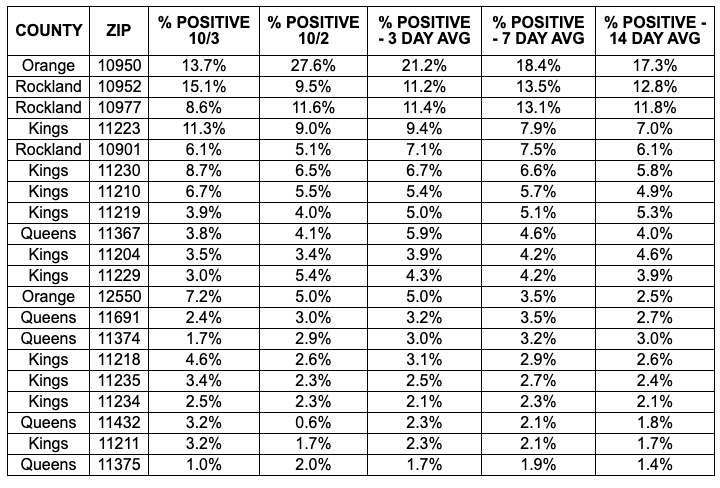 That includes ZIP codes in Orange and Rockland counties — which have by far the highest positive rates in the state — as well as in Brooklyn and Queens. In a news conference Sunday, Gov. Andrew Cuomo said the top 20 hot spots, home to 6.7 percent of the state's population, had a combined positive rate of 4.8 percent compared to 0.9 for the rest of the state.