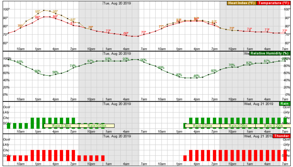 The hour-by-hour forecast shows the chance for storms is low and the humidity will be very high.