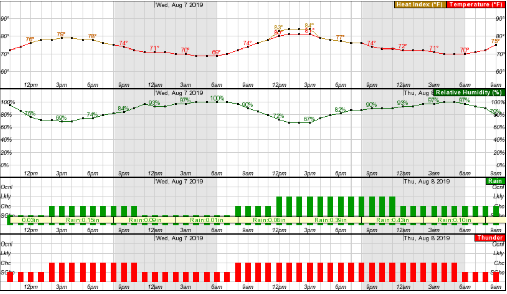 Then comes Wednesday, with a 70 percent chance of rain. The National Weather Service now forecasts a Marginal Risk for severe thunderstorms Wednesday, mainly for the afternoon and evening hours. The main threat would be damaging winds. Also, the heavy rainfall could lead to minor flooding of low lying, urban and poor drainage areas, especially Wednesday into Wednesday night. Isolated flash flooding is possible.