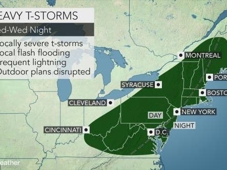 Tuesday afternoon and evening, thunderstorms are possible, and there's a 40 percent chance of rain. While most of the storms are not expected to be severe, an isolated storm or two may have the potential to produce damaging winds, the NWS said.