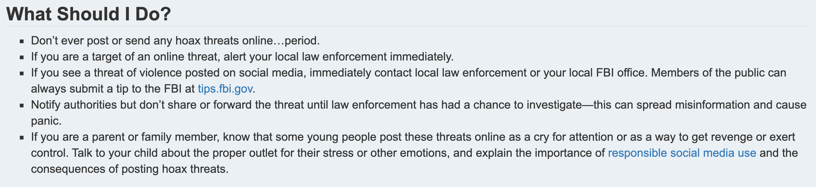 Issuing a threat—even over social media, via text message, or through e-mail—is a federal crime (threatening interstate communications), according to the Federal Bureau of Investigation. Those who post or send these threats can receive up to five years in federal prison, or they can face state or local charges. The FBI offered these tips: