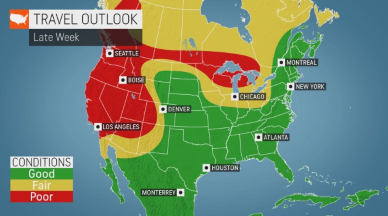 If you're traveling this week, the news is mixed. Conditions should be good on the East Coast and in the South (even in Florida after Monday's rainstorm passes through). The West and Northwest, not so much. And for Chicago, which still hasn't gotten any snow, conditions will only be fair, AccuWeather meteorologists predicted.