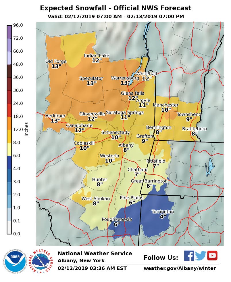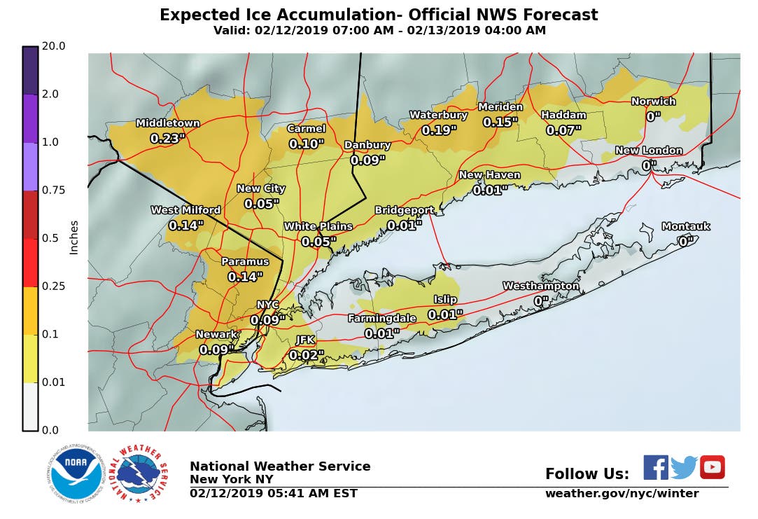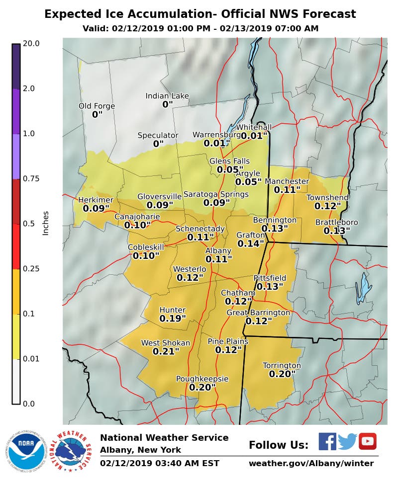 For Ulster, heavy mixed precipitation expected. Total snow and sleet accumulations of 5 to 11 inches and ice accumulations of a tenth to quarter of an inch expected
