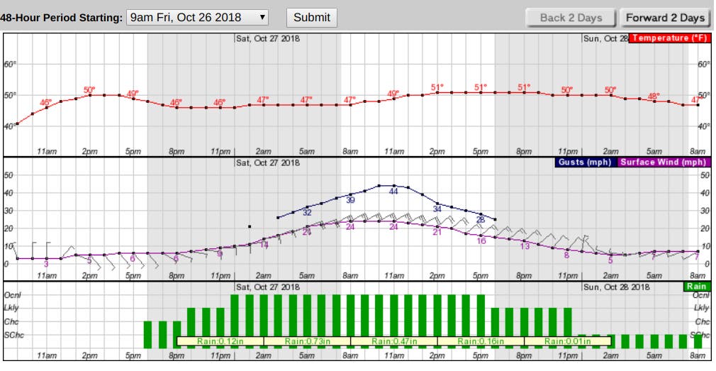 Winds from 15 to 25 mph with gusts up to 45 mph are expected late Friday through Saturday morning. Gusty winds will blow around unsecured objects. Tree limbs could be blown down and a few power outages may result.