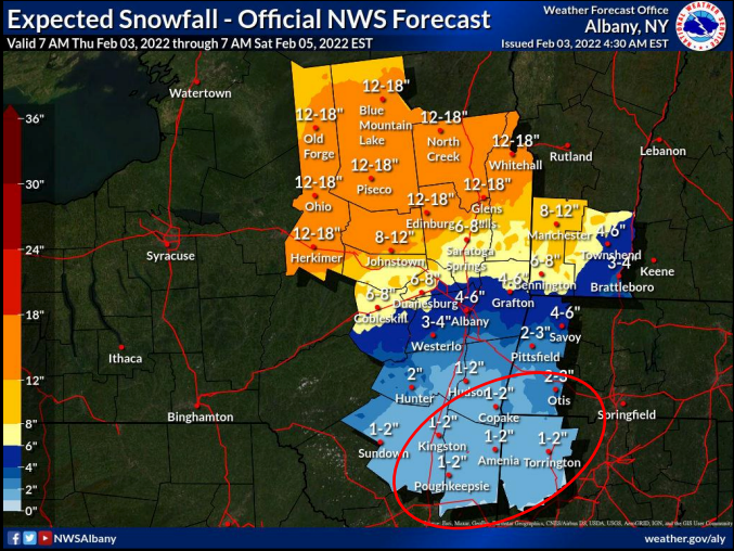 The NWS also warned of ice jam potential in smaller creeks in the mid-Hudson region, due to run-off from rainfall prior to the changeover to a wintry mix Friday morning.