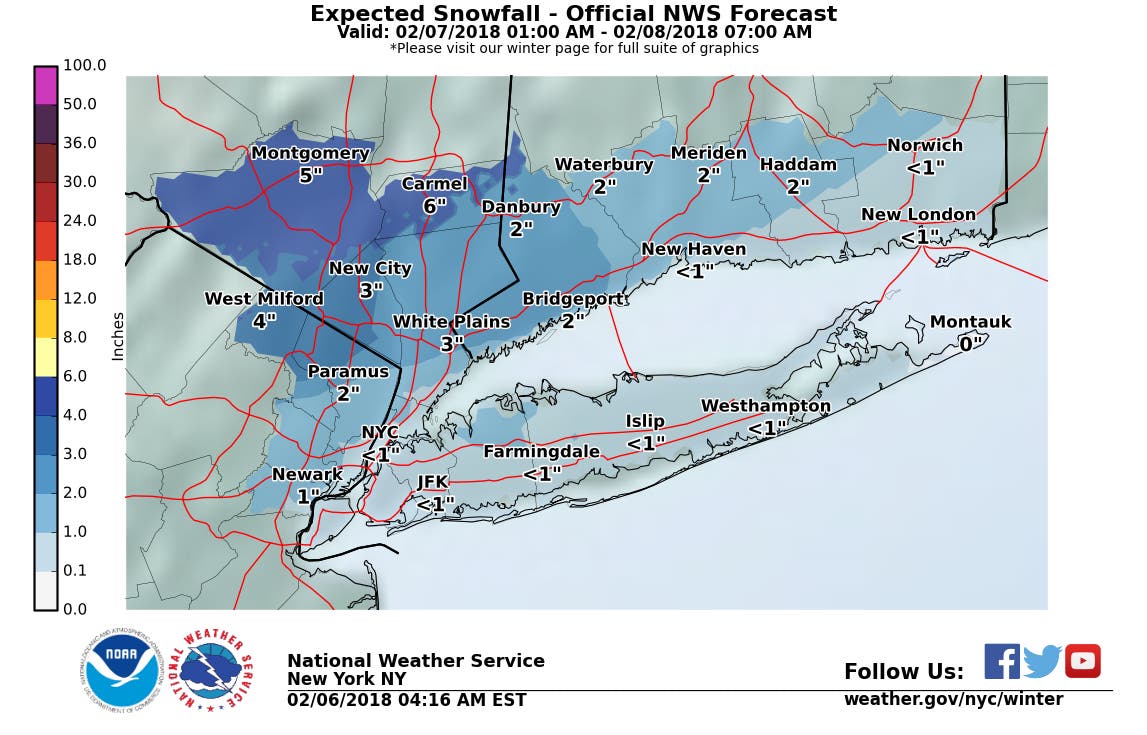 For Orange and Putnam, the NWS issued a storm watch at 3:33 a.m. in effect from February 7, 06:00 AM EST until February 8, 04:00 AM EST.