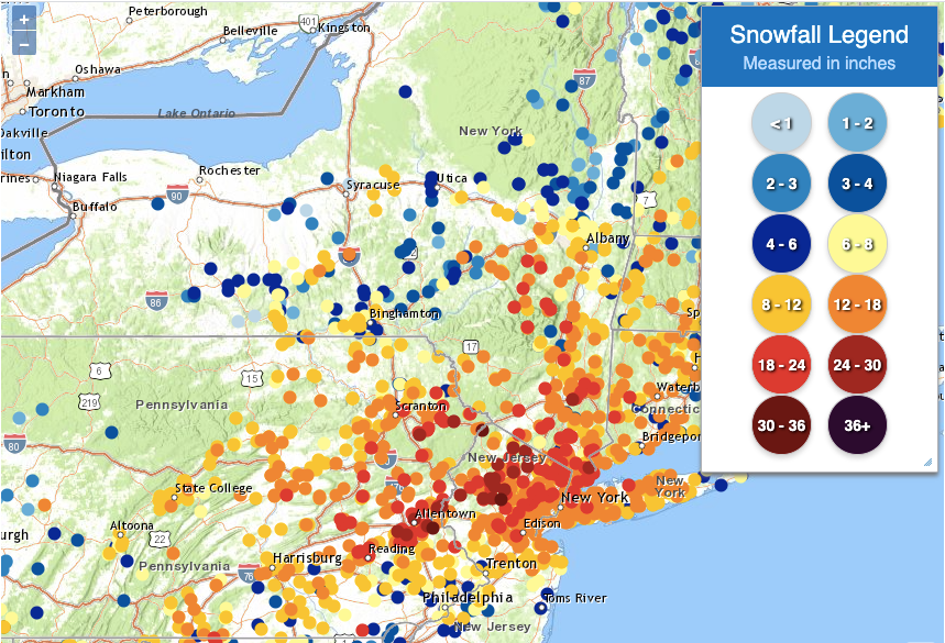 The National Weather Service made an interactive map of the snow accumulation in the past 24 hours that bears out the predictions that the lower Hudson Valley would be hardest hit when the storm began. Click on the map for more.