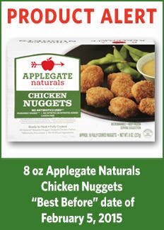8-ounce packages of Applegate Naturals Chicken Nuggets with the “Best Before” date of February 5, 2015. Please note: this is the ONLY product affected by the product removal. The product removal does NOT affect Applegate Naturals Gluten-Free Chicken Nuggets or any other breaded chicken products.