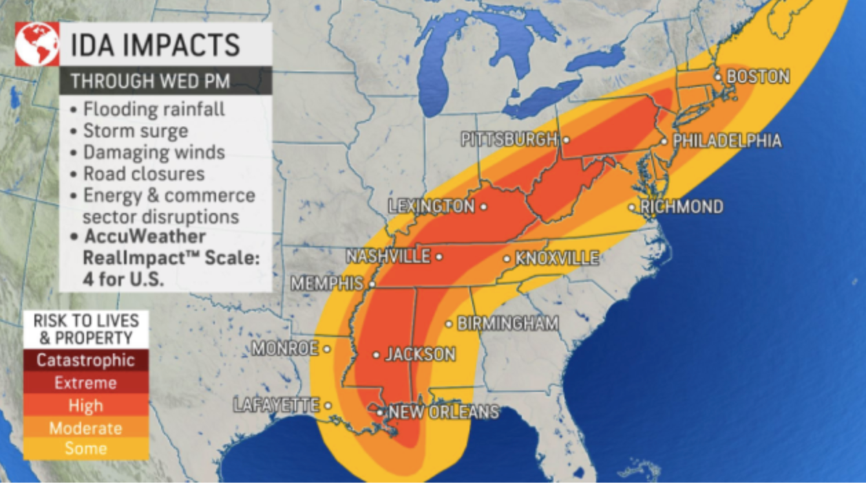 Remnants of Ida are expected to ride east-northeast along a frontal boundary into the region arriving Wednesday into Thursday. "More than 2 inches of rainfall is forecast to expand from the Tennessee Valley into portions of the Northeast and southern New England," said Courtney Travis, AccuWeather senior meteorologist.