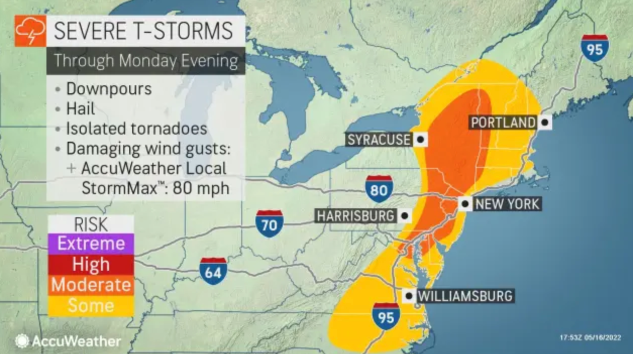 "While any location within the area at risk for severe storms into Monday evening can experience torrential downpours, damaging wind gusts and hail, it is within the area of greatest risk where widespread gusts of 60-70 mph are most likely to occur within storms, with an AccuWeather Local StormMax™ of 80 mph," said Mary Gilbert, AccuWeather meteorologist. "Winds of this magnitude can lead to downed trees and power lines and can also cause some trouble for high-profile vehicles traveling along area roadways."