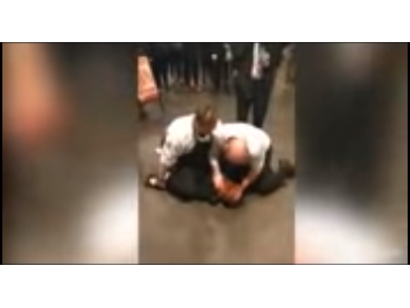 Photo: screenshot of Bill McKay, left, helping Union Street Market manager Dave Robinson, to tackle Luke Gatti, of Bayville, after a profanity-laced tirade inside the UConn restaurant on Oct. 4.