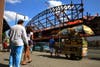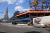 Travelling northbound on Fifth Avenue toward Flatbush Avenue, the Barclays Center now dominates the view, as the shape of the basketball arena that the Brooklyn-bound New Jersey Nets plan to call home in the 2012-2013 season takes form. In the midday heat, Atlantic Center is now cast in shadows from the steel frame as it continues to fly up.