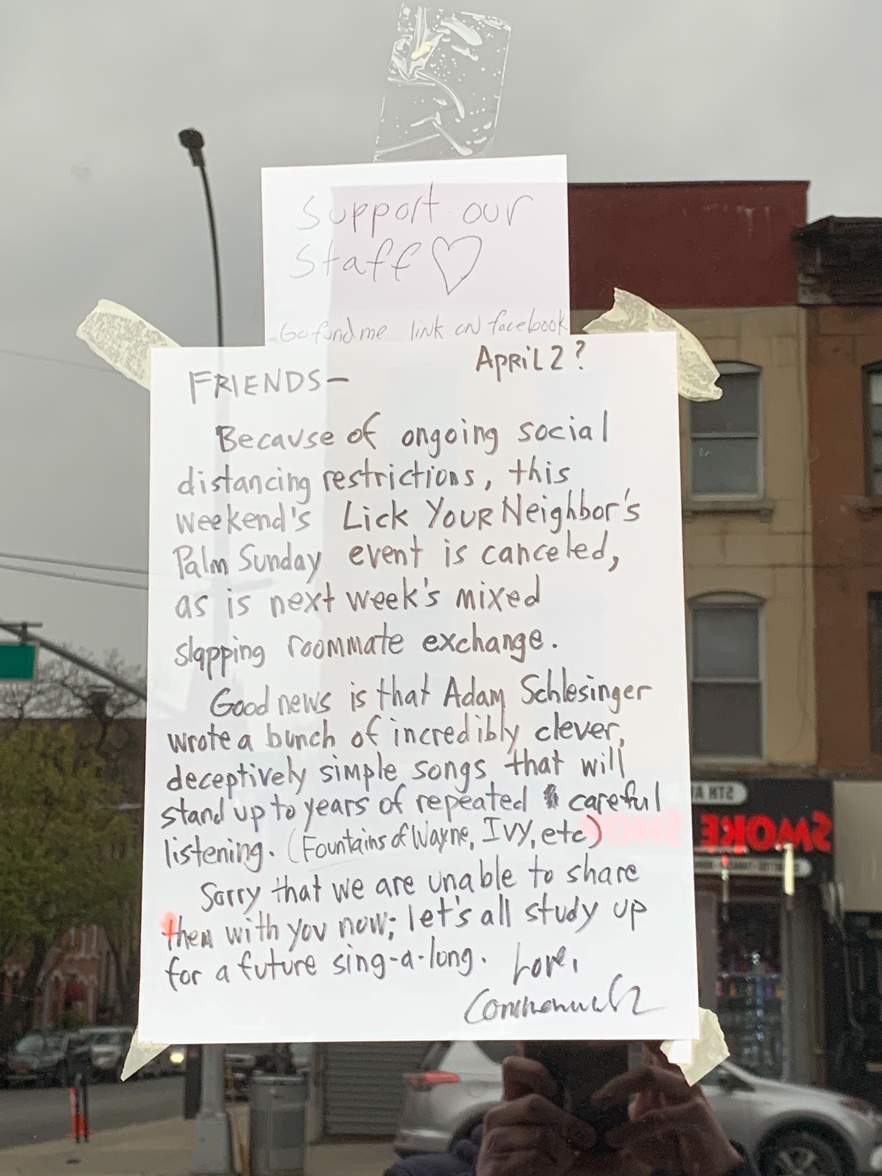 So as a way of providing levity to an otherwise grim situation, Gish has taken to creating and posting hand-written notices to his customers that announce the cancellation of the very events that wouldn’t be taking place – even if the pub known for its indie-rock-centric jukebox was open to the public.