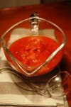 red peppers in half and throw away the seeds. Place the peppers, cut side down, on a parchment paper lined baking sheet and drizzle the peppers with the rest of the olive oil. Place both the garlic and the peppers in the oven and bake for 45 minutes. The pepper skins should be rather charred and the garlic cloves should be soft. Remove from the oven and cool the garlic on a wire rack until cool enough to touch. Let the peppers stand for 20 minutes until they are cool enough to handle. When the peppers are cool enough to handle, peel off the skins and throw them away. Chop the peppers and set aside. Remove the garlic cloves from the papers by squeezing the bottoms of the bulbs. Put the garlic cloves in either a blender or food processor. Cut the peeled tomatoes into chunks and add