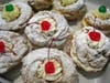 With a small knife, split fritter partway open. Spoon the cream inside, allowing it to show through the split. Press a cherry half into the cream and sprinkle with pistachios (optional). If it is not St. Joseph’s Day, you can just shake these, without the filling in a bag with confectioners’ sugar and serve like donuts.