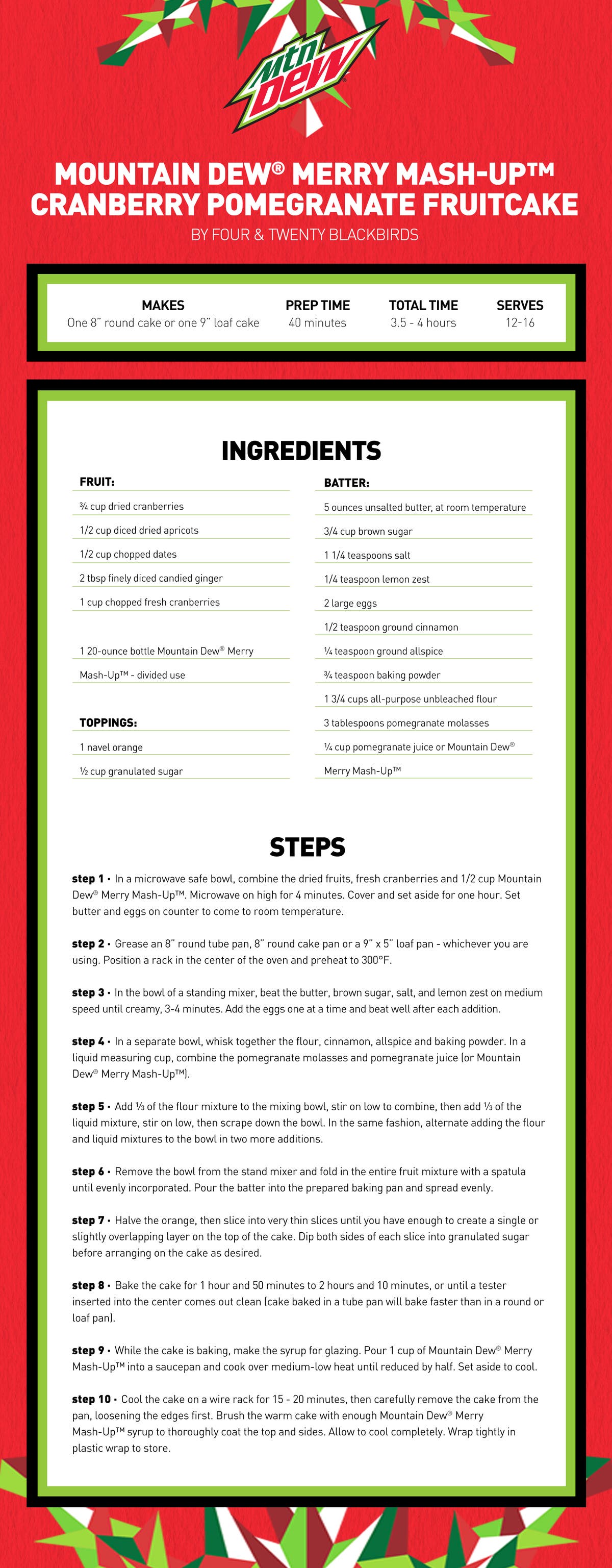 But the out of the ordinary addition to the holiday fruitcake is actually the star of the dish. The Brooklyn-based pie shop teamed up with Mountain Dew to create a cake featuring its limited-edition holiday flavor.