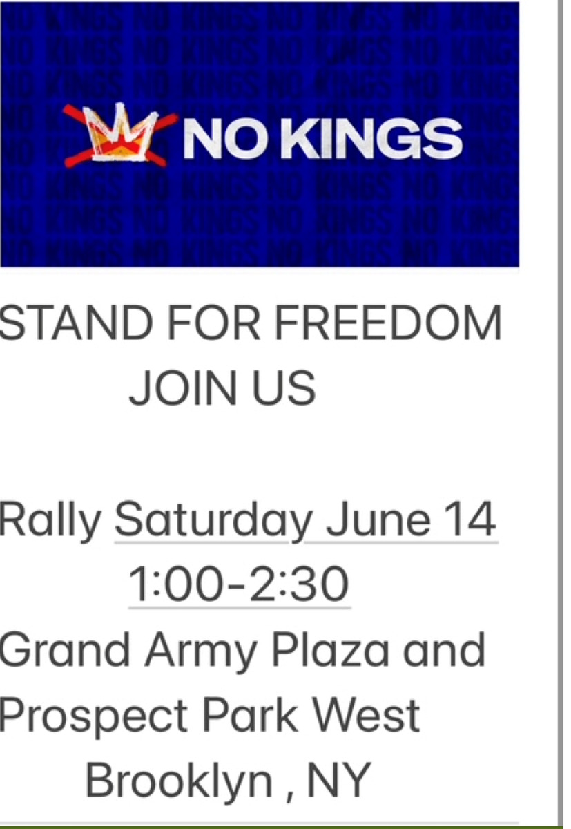 Park Slope|Local EventBrooklyn June 14th No Kings Day RallySuzanne Nicoletti-Krase, NeighborJun14Event DetailsSat, Jun 14, 2025 at 1:00 PMAdd to calendarGrand Army Plaza & Prospect Park West, NY, 11238Brooklyn Rally for No Kings DayShare