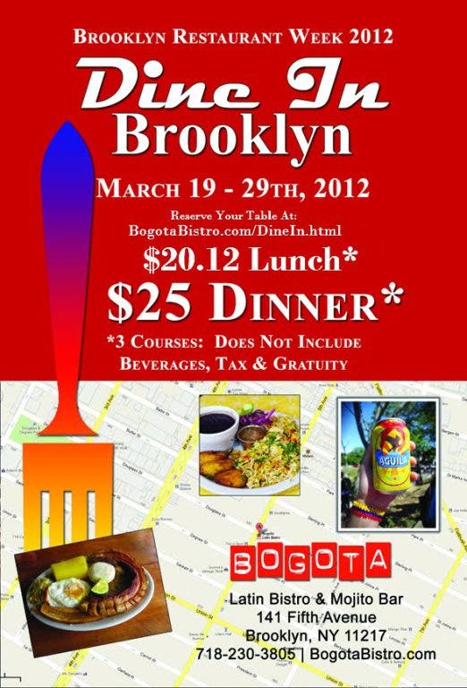 Check out Brooklyn's culinary landscape ... invite friends from Manhattan and beyond! Bogota Latin Bistro is participating in this gastronomic event by offering a $20.12 lunch and a $25.00 dinner through from March 19th through March 29th. Brunch not included. Reservations can be made on our website at http://BogotaBistro.com. "Like" us on Facebook at http://facebook.com/BogotaBistro