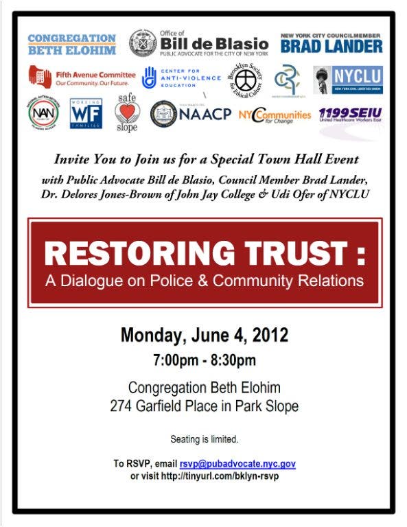 Join us for a Special Town Hall Event on Police & Community Relations with Public Advocate Bill de Blasio, Council Member Brad Lander, Dr. Delores Jones-Brown of John Jay College, Udi Ofer of NYCLU and more.