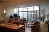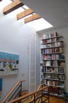 "We wanted a comfortable openness, so we designed the kitchen open to the dining and living spaces." Glass block openings and back-splash in the kitchen let natural light in from the industrial glass garage door at the front of the building. The office/studio at the back of the house gets light from the courtyard, while providing access to a charming rear yard enclosed in original brick. Up the open steel and oak staircase, a large 14-foot skylight showcases the home's original roof rafters. The home incorporates radiant floor heating and central air-conditioning; however, cross ventilation from the courtyard is such that artificial cooling is not often needed.