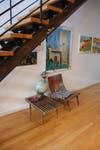 History lives on in this Fourth Street home thanks to the couple's commitment to preserving original detail. The original brickwork, stone sills, and steel lintels on the façade of the building remain intact, as does the beam used to hoist hay bales up to the second floor loft. In the open-air foyer, bricks from the old chimney poke through. Upon excavating for the courtyard, the couple unearthed horseshoes, horse ointment jars, and turn-of-the-century medicine bottles, which they have displayed on a floating millwork beam in the kitchen area.