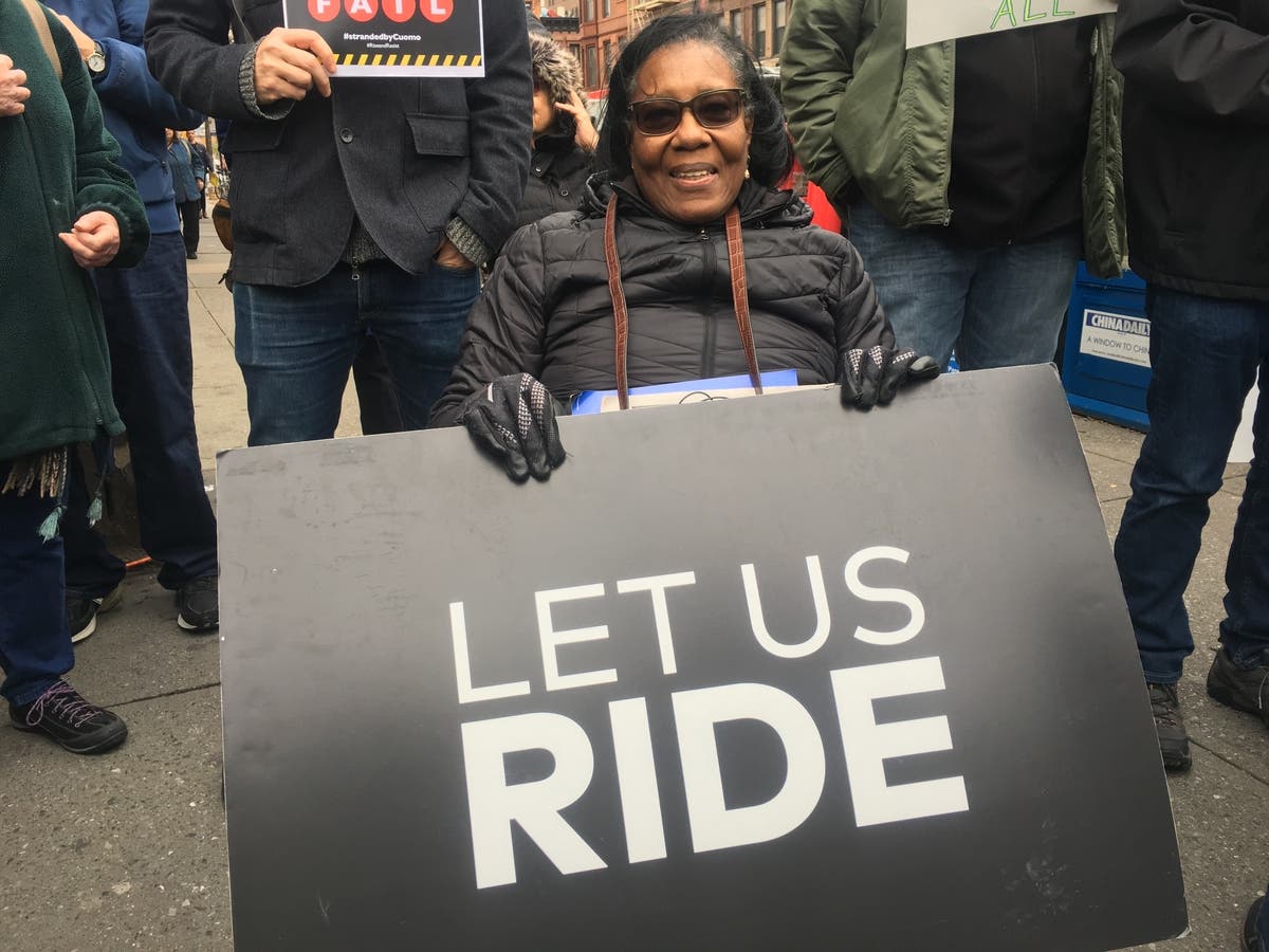 Photo caption: Monica Bartley, 62, relies a wheelchair and said it was impossible for her to get to the rally by subway. Photo by Kathleen Culliton
