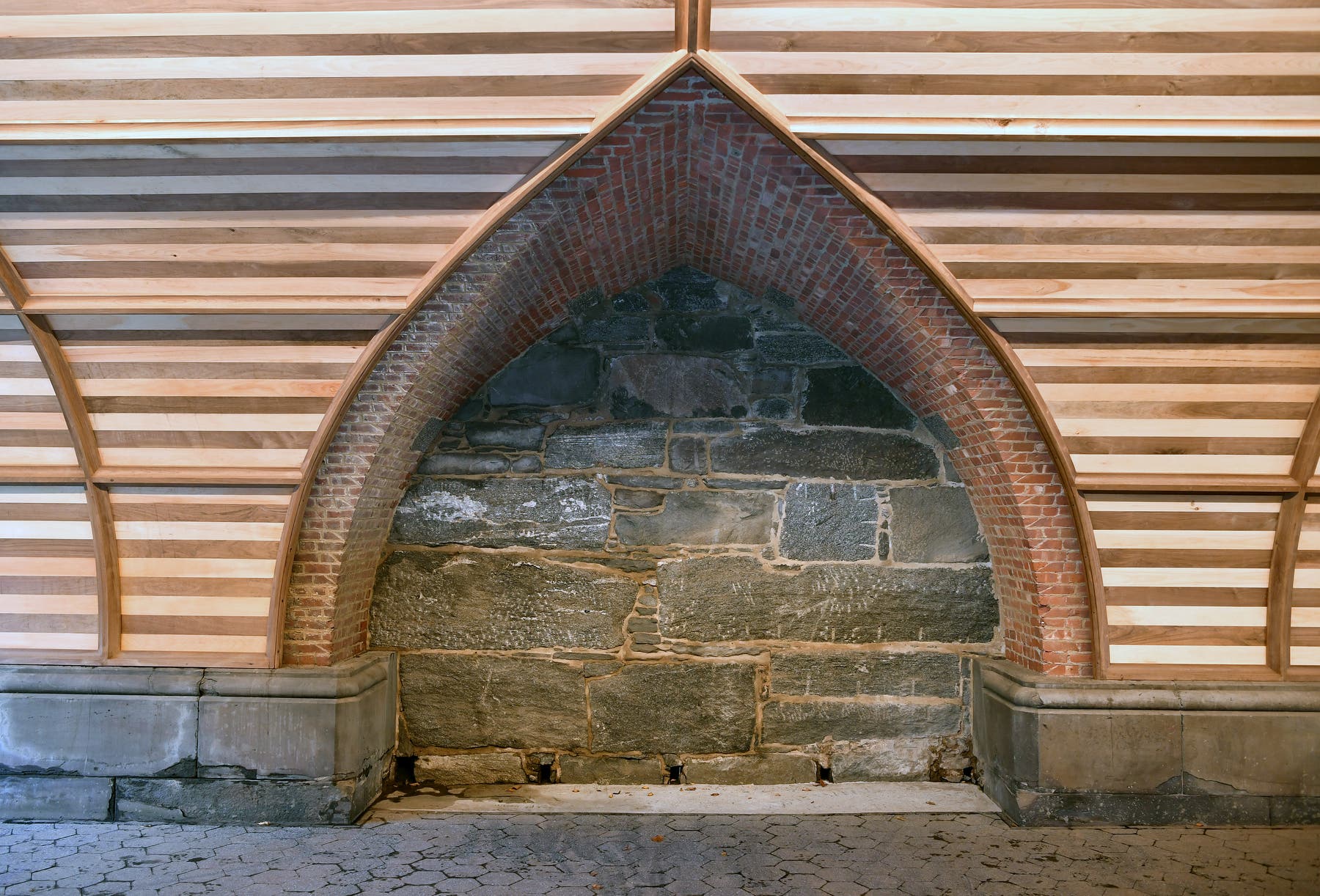 The motif of alternating yellow Berea sandstone and New Jersey brownstone, and white pine and black walnut wood paneling were restored to their original detail, though the team opted to leave one brick and granite cross vault exposed to highlight the detailed craftsmanship put in place over 150 years ago.