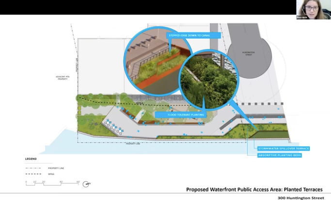 The esplanade, developers said, would include bench seating, a canopy of plants and steps to the canal along the block between Smith and Ninth streets. It would be accessed by walking down Huntington Street.