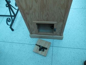The heist happened July 16 at Our Lady of Mount Carmel Roman Catholic Church near North Ocean Avenue and state Route 27, or Sunrise Highway, Suffolk County police said. Photos showed someone pried open a small wooden door at the base of the boxes to access the money.