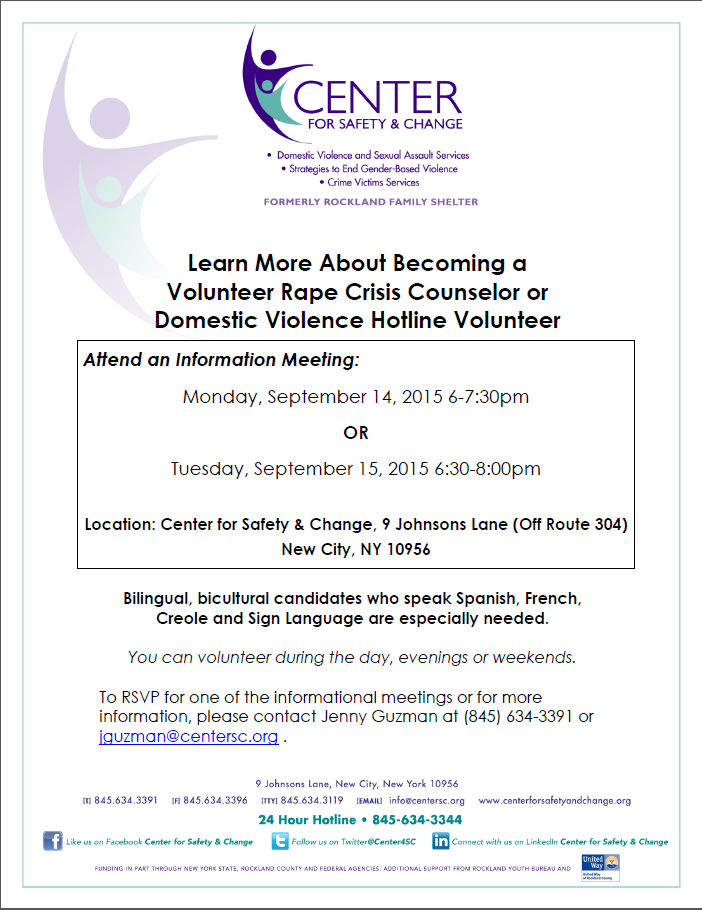 Center for Safety & Change is in need of volunteers who are interested in becoming rape crisis counselors and/or answering domestic violence hotline calls. Those interested are invited to attend an information session on Monday, September 14th from 6-7:30 p.m., or Tuesday, September 15th from 6:30-8:00 p.m. at the Center for Safety & Change, 9 Johnsons Lane, New City, NY. Attendance at one information session is necessary.