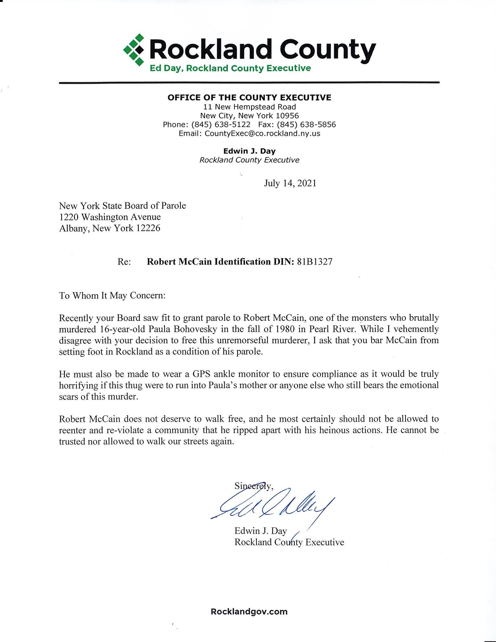 On Thursday, Rockland County officials posted a copy of Day's letter to the parole board along with Robert McCain's Identification DIN - 81B1327 and the address and phone number of the New York State Board of Parole. Officials urged all Rockland residents to contact the parole board "on behalf of Paula's mother Lois."