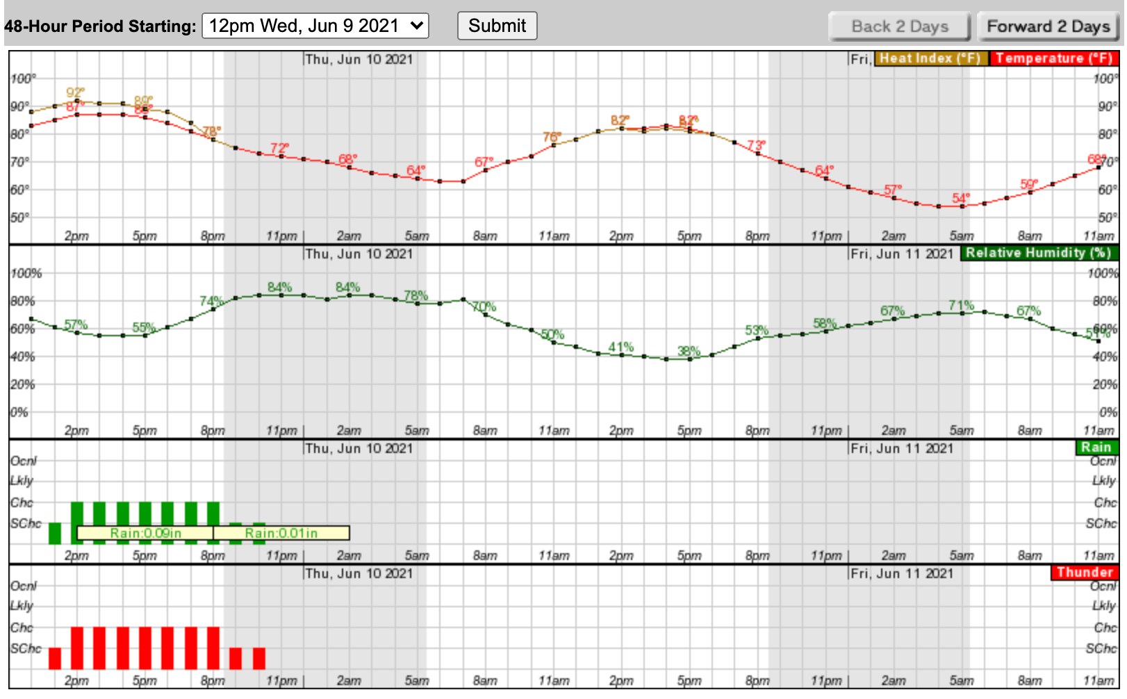 Expect thunderstorms and high humidity, says the National Weather Service.