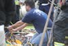 The emergency workers used a tripod to help lift the man out of the trench. Arterburn estimated the man was about six feet down into the trench.