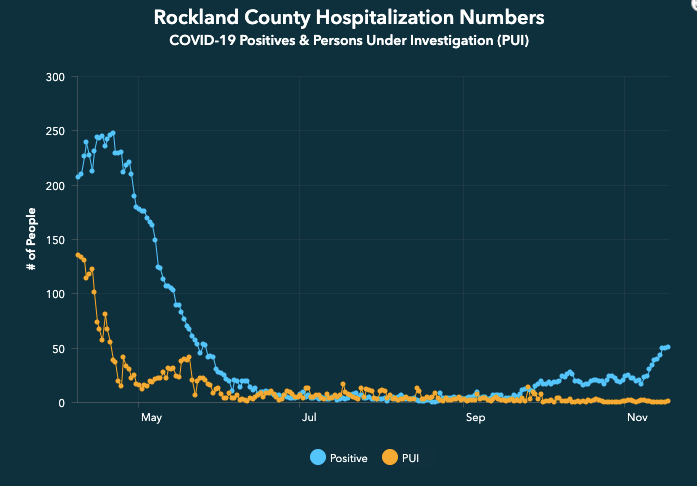 In Rockland County, there are 1,524 active cases, up from 992 just 10 days ago. There are 52 people hospitalized with confirmed or suspected cases of COVID-19. Another resident has died, and the death toll is now 691.