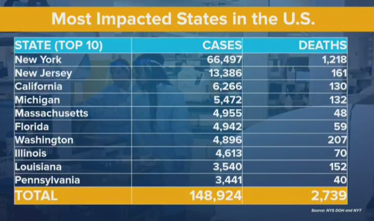New York state has 66,497 confirmed cases as of Monday morning.