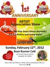 One great year of the greatest variety of performers in the world! Come out and celebrate with us to see one of the greatest shows of entertainment ever put together with some of your favorite artist. The Bean Runner Cafe is expected to be MSG with the talent touching the stage this night! We're celebrating one year of such a great show with some Valentine's Day raffles as well! Another show you won't want to miss, with the beginning of the show from 415-5 an open mic segment as well! Tell a friend to tell a friend, tell a cousin to tell a cousin, tweet about it, share it on FaceBook, Myspace if you still use that too! $5 admission only as always!!!