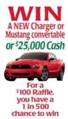 Win a new charger or ford mustang convertible or $25,000 cash in our new car raffle where you have a one in 500 chance to win.