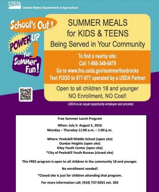This year meals are being served at Peekskill Middle School, Dunbar Heights and the Kiley Youth Center Monday through Thursday 11 a.m. to 1 p.m.