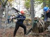 Photo 1 Caption: Bard College student volunteer (center) with NY-NJ Trail Conference volunteer crew members move rock to build new trail. Photo Credit: Andrea Minoff