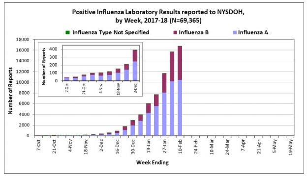 As of Feb. 10, 69,365 laboratory confirmed cases of influenza have been reported in New York and 14,354 people have been hospitalized. There have been 5 pediatric influenza deaths and 11,036 children under the age of five have been diagnosed with lab confirmed influenza and 926 have been hospitalized, state officials said.