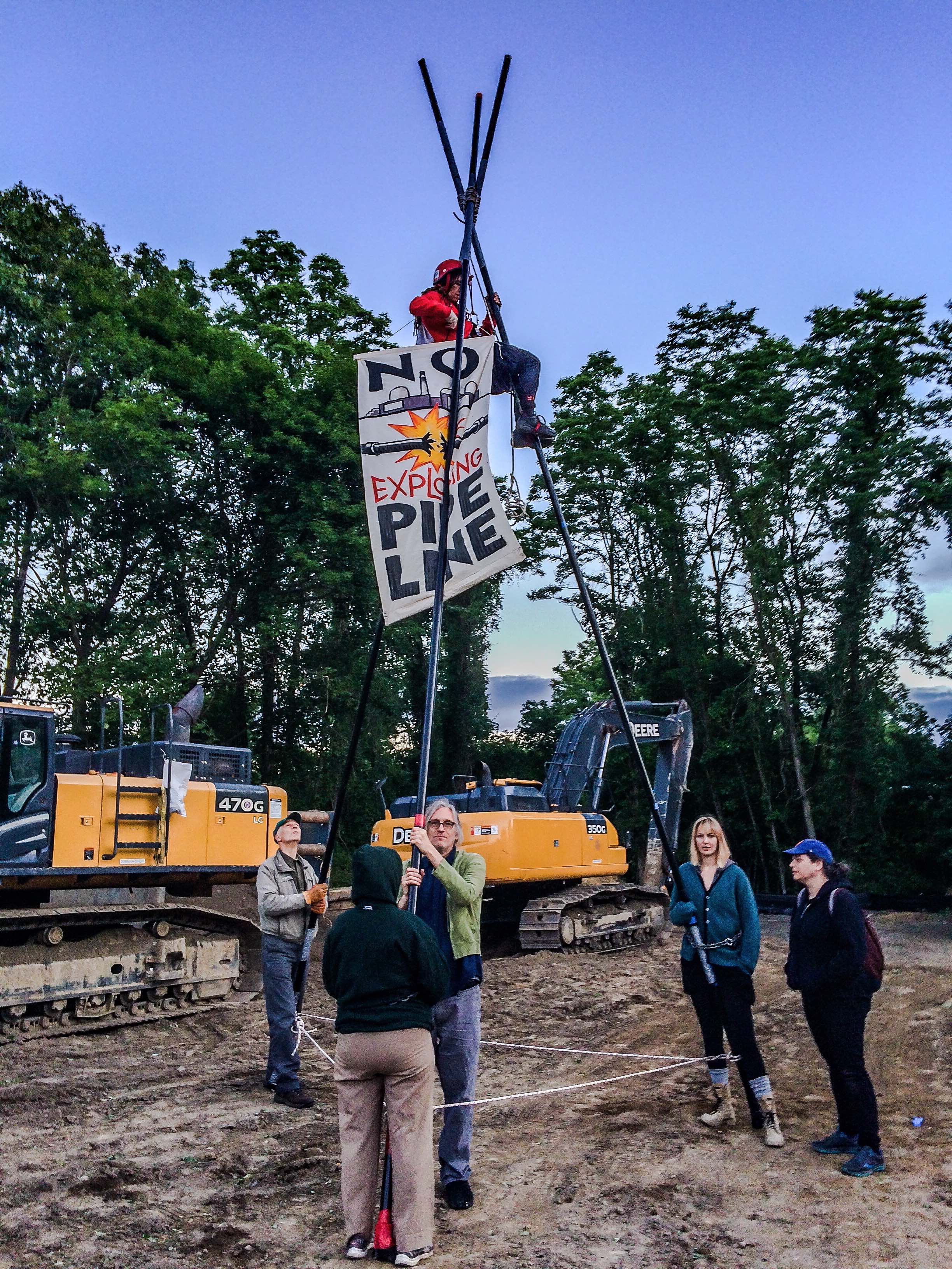 As part of an escalating peaceful resistance campaign, concerned New Yorkers engineered a dramatic and elaborate protest against pipeline construction early this morning. A team erected a 20-foot-tripod in the path of construction equipment, and then a woman who grew up in Croton climbed up and sat at the top, thereby effectively halting construction. Additionally, two people locked to the base of the tripod. A total of six people have been arrested and taken to the Peekskill Police Station.