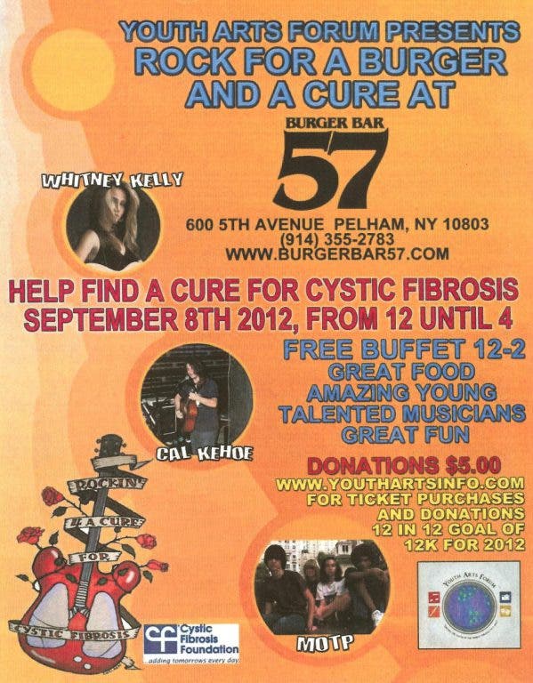 Burger Bar 57 in Pelham, the Youth Arts Forum and the Cystic Fibrosis Foundation are teaming up for Saturday's event, "Rock for a Burger and a Cure." Proceeds from the event will be given to the Cystic Fibrosis Foundation.