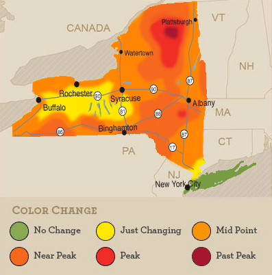 Rockland County spotters in New City and at Bear Mountain State Park expect foliage to be at midpoint by the weekend with 50 percent color change and bright orange, red and yellow leaves. Look for 40 percent leaf change in Columbia County. Spotters in Hudson are expecting midpoint conditions for the coming weekend with bright yellow and orange leaves along with some deep shades of red.