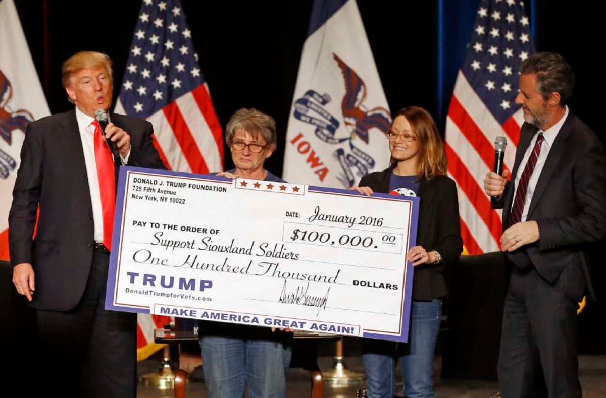 The complaint cites a February 2016 Trump campaign event in Iowa billed as a fundraiser for veterans groups. The foundation raised more than $2.8 million in donations at the event, but let the campaign control which groups received the money, the complaint says. Trump used the gifts for political purposes, handing out large checks to representatives of veterans groups at campaign events.
