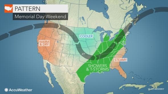 "The forward speed of the next storm will determine if Memorial Day ceremonies and barbecues are inconvenienced by a passing thundershower or washed out by periods of rain," AccuWeather Senior Meteorologist Alex Sosnowski said.