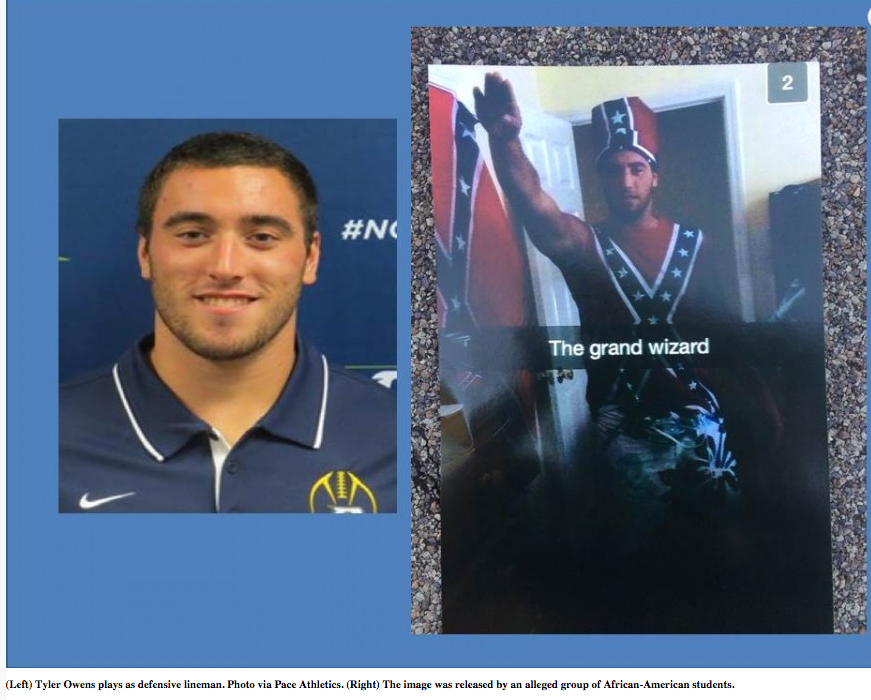 A photo of a Pace University senior who is also a captain of the football team recently appeared on the social media platform Snapchat and in news segments aired by Westchester broadcast media. The photo depicts the student draped in a Confederate battle flag and giving what appears to be a Nazi salute. An investigation of the circumstances surrounding the taking of the photo and its appearance on social media is being conducted immediately.
