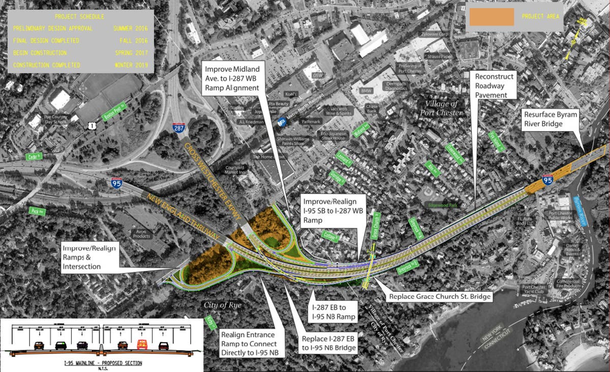 The area contains a six-ramp interchange system with the Cross Westchester Expressway (I-287) and Midland Avenue in the City of Rye and Village of Port Chester.