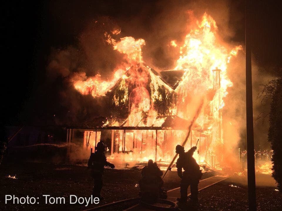 Caleigh called 911 and Anson rushed to his garage and retrieved a ladder, then placed it near the second story window of 2 Minto Court where homeowners Jason and April Noon were screaming for help. The front of their house was fully engulfed in flames at the time.