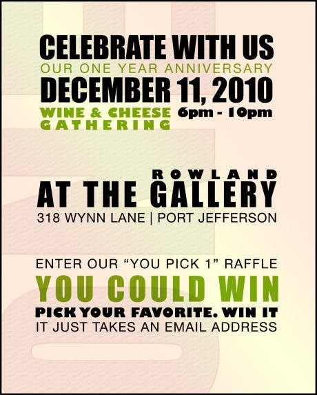 This Saturday night, December 11th, 2010, we are having a little wine and cheese gathering at The Gallery. Its a little celebration of sorts… The Gallery is turning ONE!