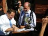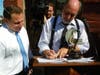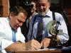 Jim Faith who is chairman of the board of directors for the Music Hall of Fame accepted the keys to the building from Councilman Fiore-Rosenfeld after signing the license agreement.